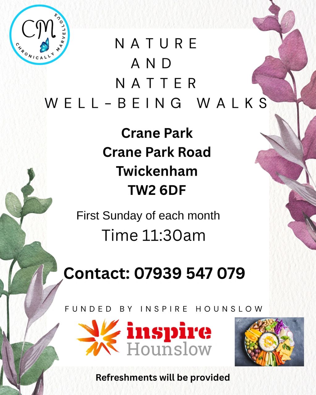 We will now be moving our Nature & Natter Well-being Walk to Crane Park instead of Hounslow Heath, effective immediately.