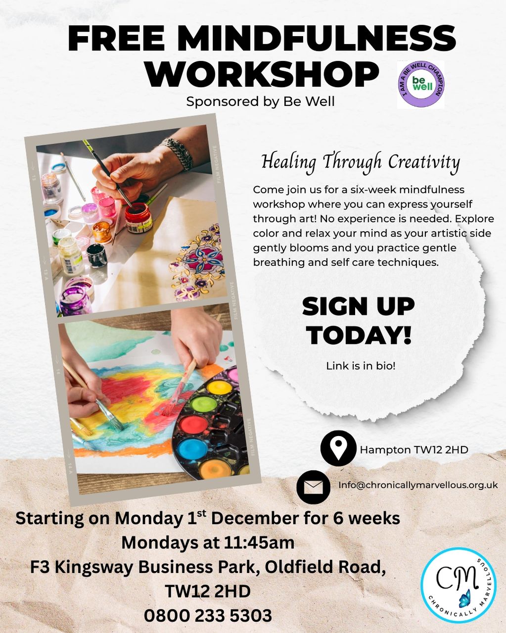 Come join us for a six-week mindfulness workshop where you can express yourself through art! No experience is needed. Explore color and relax your mind as your artistic side gently blooms and you practice gentle breathing and self care techniques.